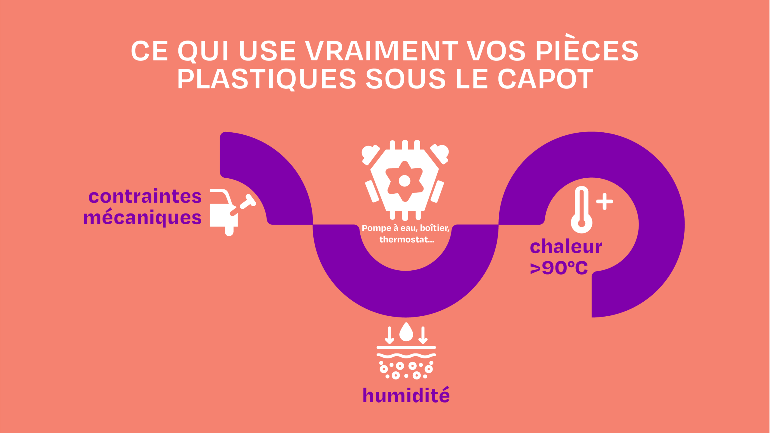 Sous le capot de nos voitures, un combat silencieux se joue. Les matériaux qui composent pompes, carters ou autres pièces plastiques affrontent chaleur, humidité et contraintes mécaniques… comme nous affrontons soleil, pluie et stress au fil des années. Sauf qu’eux n’ont pas droit à la crème solaire.