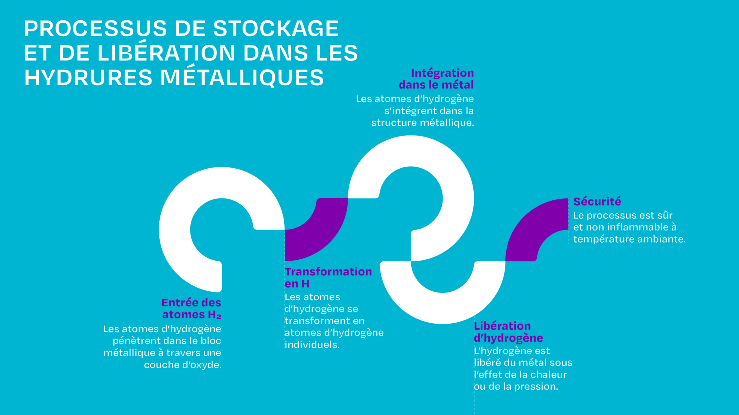 Les matériaux utilisés sont des métaux qui sont capables d’absorber l’hydrogène pour former des hydrures métalliques. Ce sont des alliages qui vont se transformer en présence d’hydrogène à une température que l’on souhaite proche de l’ambiante. Ils vont ainsi stocker l’hydrogène puis le relâcher sur demande, en modifiant simplement la pression et/ou la température. Un procédé propre, sûr et réversible.