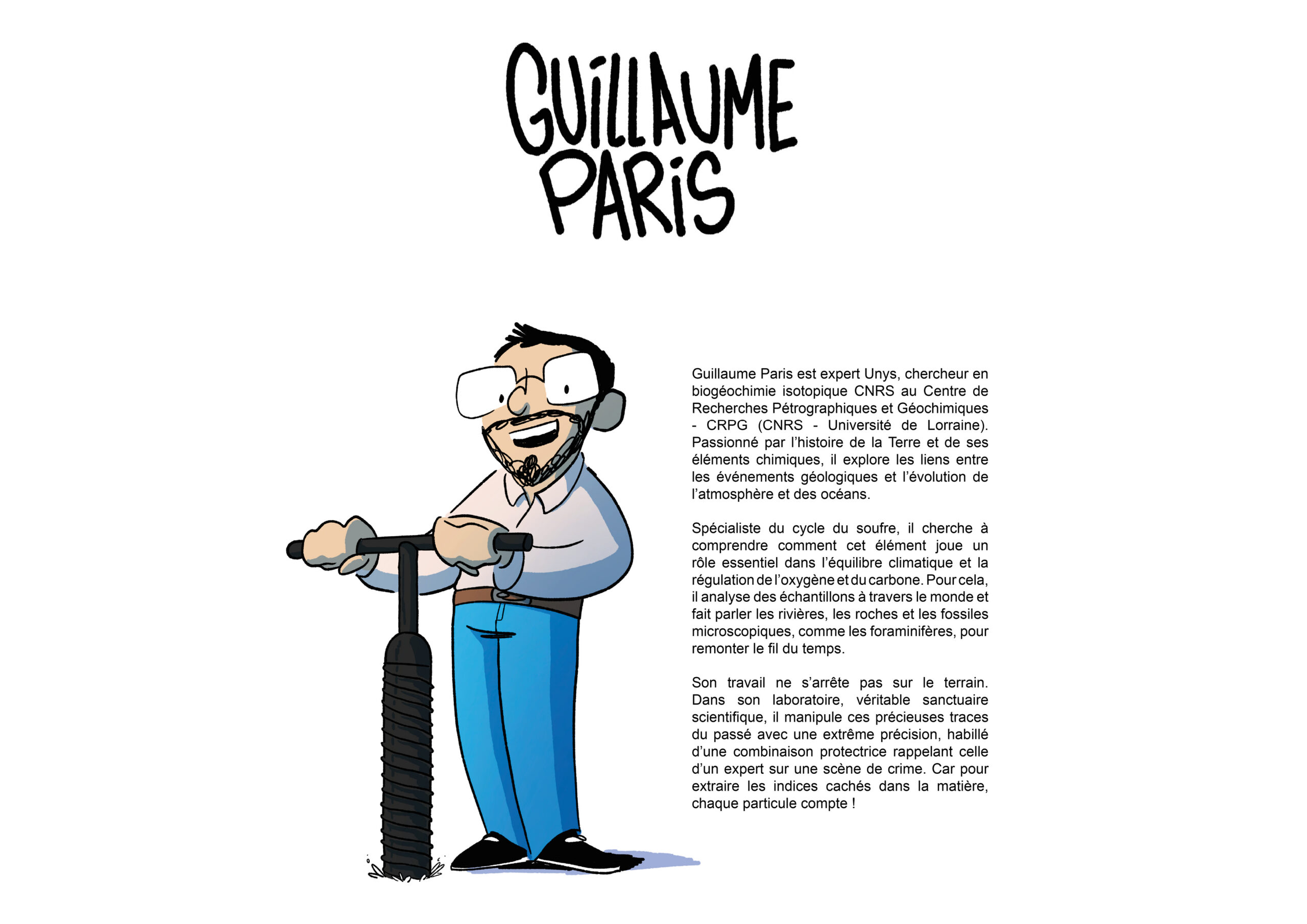 Spécialiste du cycle du soufre, il cherche à comprendre comment cet élément joue un rôle essentiel dans l’équilibre climatique et la régulation de l’oxygène et du carbone. Pour cela, il analyse des échantillons à travers le monde et fait parler les rivières, les roches et les fossiles microscopiques, comme les foraminifères, pour remonter le fil du temps.